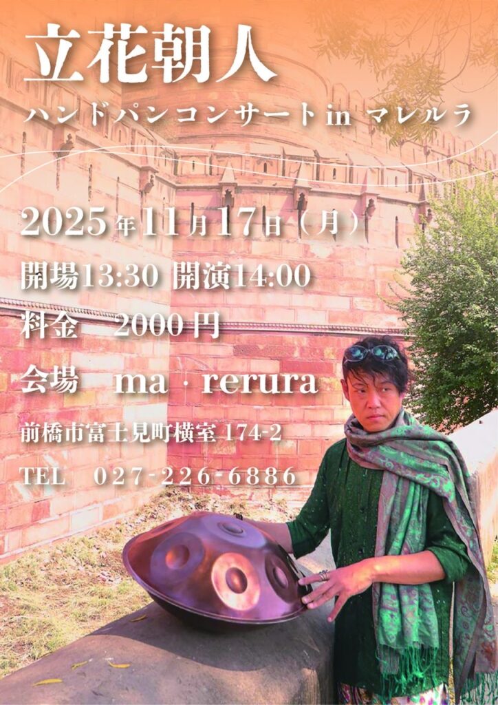昨年好評だった立花朝人ハンドパンコンサートを、今年もマレルラさんで開催していただくことになりました。癒しのひとときを、ぜひご一緒に!